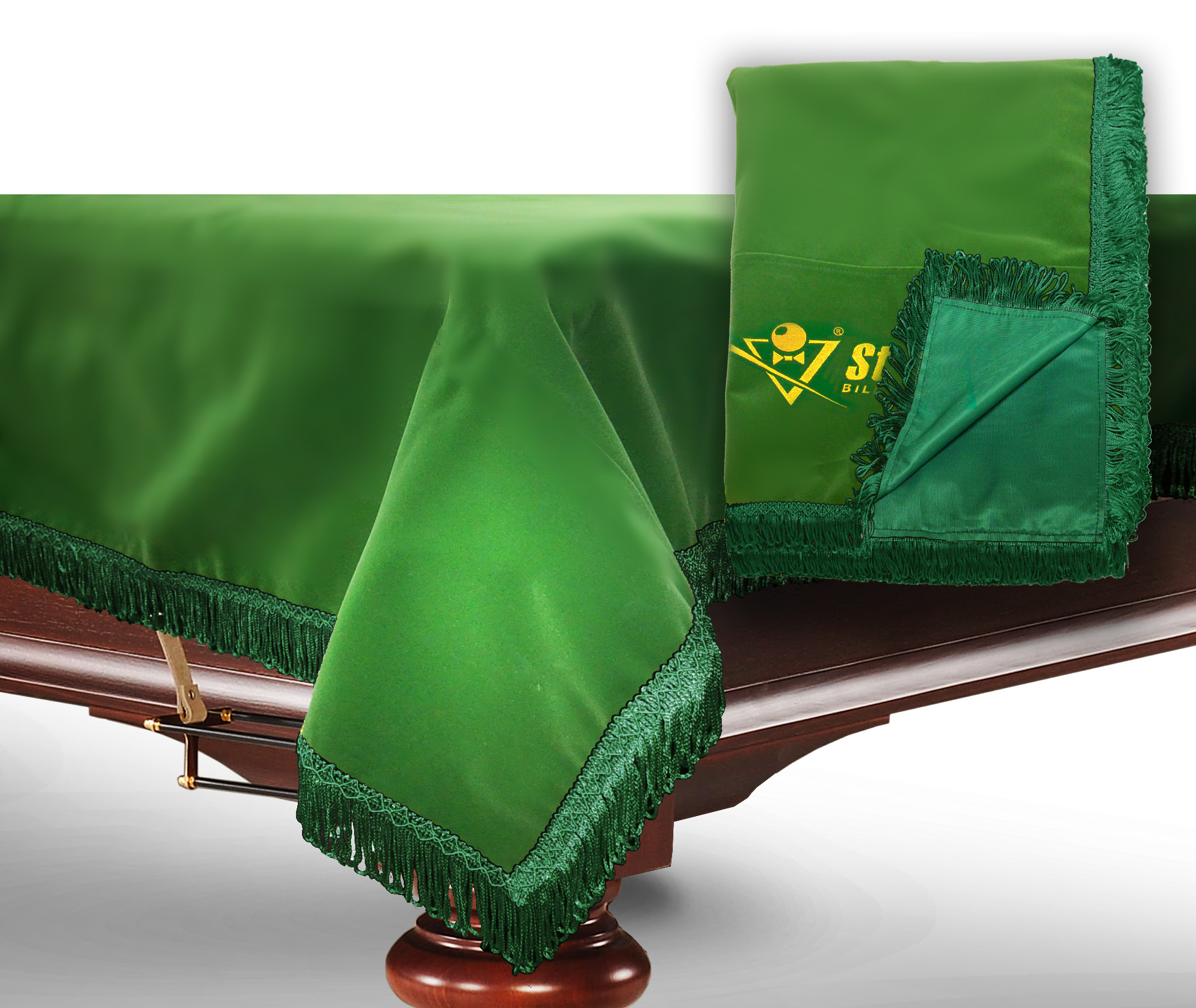 Чехол бархатный, обрамленный бахромой, надежно предохраняет бильярд от внешних воздействий. Изготовлен из бархата - мягкой ткани, с коротким ворсом и шелковистым блеском - смотрится стильно и роскошно. Края покрывала украшены ярко-желтой бахромой. Основная функция чехла — защищать бильярдный стол от повреждений, пыли и влаги, яркого солнечного света. Стол накрывают чехлом на то время, когда он не используется в игре. В любом помещении всегда есть пыль, и она будет оседать на неприкрытое сукно, постепенно впитываясь в него. Слишком частые чистки сукна щетками не желательны, так как это приводит к его преждевременному износу, а услуги по перетяжке сукна на бильярдном столе недешевы. Использование чехла является логичным решением для минимизации затрат по уходу за бильярдным столом.