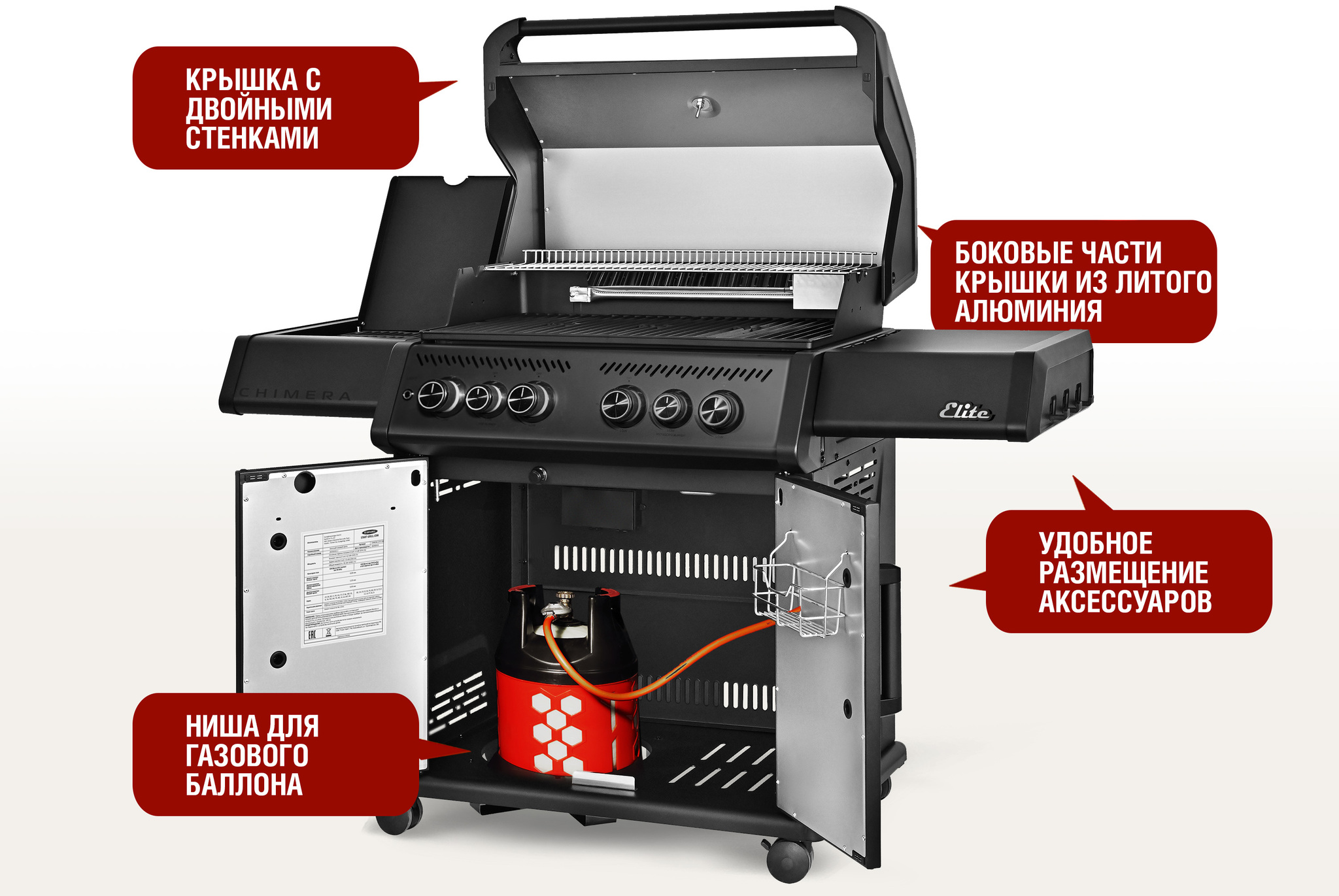 CHIMERA ELITE 500. ПРЕМИАЛЬНЫЙ ПОДХОД К КАЖДОЙ ДЕТАЛИ Chimera Elite 500 — это профессиональный газовый гриль, созданный для тех, кто ценит качество, удобство и универсальность в приготовлении блюд на открытом воздухе. Благодаря продуманной конструкции и высокотехнологичным решениям, этот гриль станет незаменимым помощником на кухне или террасе. Высокая двойная крышка увеличивает объем гриля, улучшая циркуляцию и распределение тепла, что делает Chimera Elite 500 идеальным решением при приготовлении большого количества блюд, а также позволяет беспрепятственно использовать вертел. Общая мощность 20 кВт обеспечивает быстрый нагрев и равномерное приготовление блюд, позволяя наслаждаться кулинарными шедеврами. Четыре основные горелки общей мощностью 12 кВт позволяют готовить сразу несколько блюд. Инфракрасная боковая горелка мощностью 4,5 кВт - зона сильного жара, с помощью которой можно задавать хрустящую корочку блюдам. Задняя горелка мощность 3,5 кВт расширяет возможности приготовления и становится незаменимой при использовании вертела. Пластины-испарители с минимальным зазором защищают горелки от жира, что упрощает процесс очистки гриля и создают эффект BBQ, концентрируя аппетитные ароматы. Жаровня изготовлена из литого алюминия, который отлично удерживает и распределяет тепло. Обширная жарочная поверхность размером 3268 см? #40;76?43 см#41; и чугунные решетки обеспечивают идеальную прожарку и аппетитные рисунок. Система распределения тепла E-Fire: Двухуровневая инновационная технология обеспечивает идеально равномерный нагрев по всей площади гриля, исключая холодные зоны и минимизируя расход газа. Первый уровень системы - теплораспределительные пластины, расположенные под углом над горелками. Жароотсекатели смягчают прямое воздействие пламени на пищу. Широкие металлические пластины позволяют добиться идеальных условий для равномерного распределения тепла и медленного приготовления блюд, сохраняя их сочность и насыщенный вкус. На втором уровне находится перфорированный диффузор из нержавеющей стали, система E-Fire рассеивает тепло по всей жарочной поверхности, исключая холодные зоны,nbsp;nbsp;обеспечивает равномерную и быструю прожарку стейков и других блюд, позволяя получить аппетитную корочку, не пересушить мясо и сохранить соки. Преимущества: • Равномерный жар: Пластины равномерно распределяют тепло, исключая возможность возникновения “холодных” участков. • Экономия газа до 20#37;: Благодаря эффективному распределению тепла, энергия не уходит впустую, что делает использование гриля более экономичным. Удобные функции, такие как складные боковые столики для дополнительного рабочего пространства, корзина для специй на дверце, ниша для газового баллона и съемный поддон для сбора жира, делают процесс приготовления еще более комфортным. Термометр позволяет контролировать температуру внутри г...