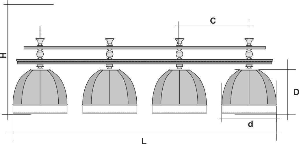 Ни для кого не секрет, что качественное освещение способствует не только хорошей игре, но и не оставляет усталости глаз после продолжительной игры в бильярд. Светильники Аристократ-Люкс обладают всеми необходимыми характеристиками, чтобы игра в бильярд приносила только удовольствие. Условные схематические обозначения: Н — общая высота светильника / 2065 мм L — общая длина светильника / 2420nbsp;nbsp;мм D — высота плафона / 395 мм d — диаметр плафона / 500 мм C — расстояние между осями / 640 мм