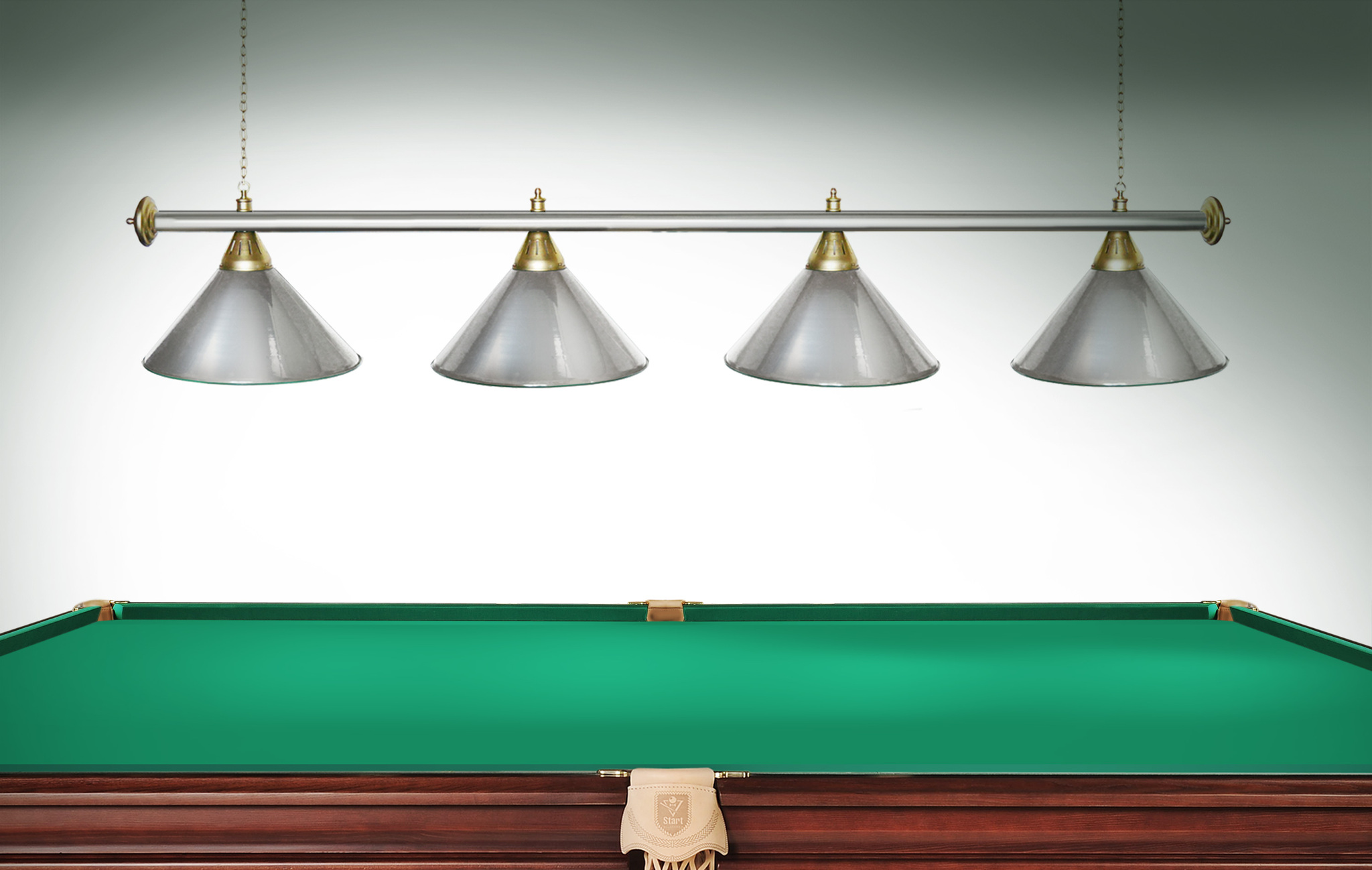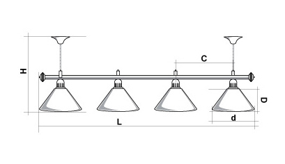Светильники Startbilliards производства ФС «Горизонт» с 4-мя плафонами комплектуются к столам 8 и 9 футов. Укомплектованы цельной металлической штангой с полимерным покрытием. Штанга изготовлена из цельной трубы, что исключает искривление конструкции. Применение керамических патронов #40;Е27#41; увеличивает срок эксплуатации светильника. Металлические плафоны крепятся с помощью зажимных пластин. Длина подвесной цепи 100 см — оптимальное расстояние для расположения источника света над игровым полем стола. В комплект включены две потолочные чашки диаметром 10 см. Штанга и плафоны поставляются в отдельных упаковках. Условные схематические обозначения: Н — общая высота светильника / 1420 мм L — общая длина светильника / 1920nbsp;nbsp;мм D — высота плафона / 300 мм d — диаметр плафона / 370 мм C — расстояние между осями / 500 мм Штанга и плафоны поставляются в отдельных упаковках.