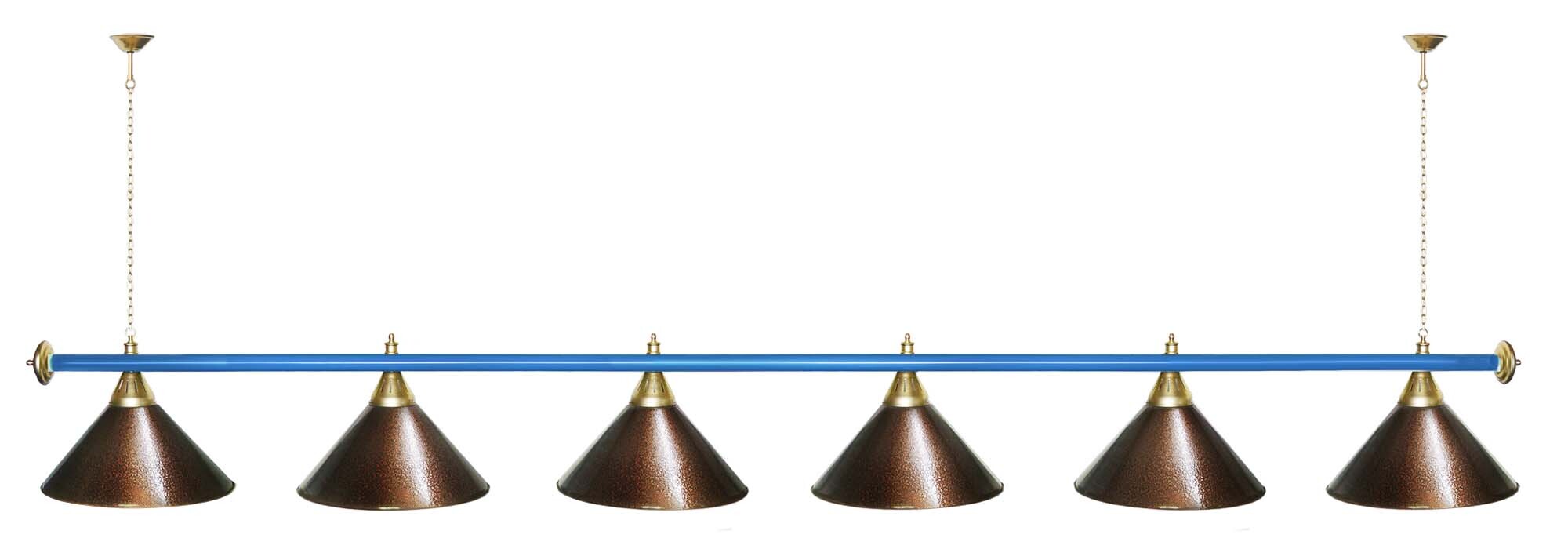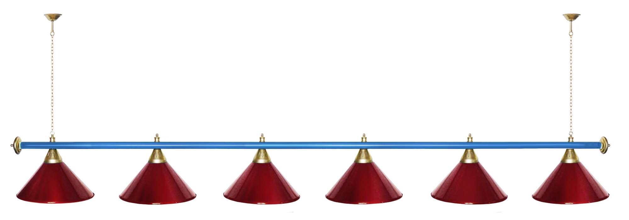 Светильники Startbilliards производства ФС «Горизонт» с 6-ю плафонами комплектуются к столам 12 футов. Укомплектованы цельной металлической штангой с полимерным покрытием. Штанга изготовлена из цельной трубы, что исключает искривление конструкции. Применение керамических патронов #40;Е27#41; увеличивает срок эксплуатации светильника. Металлические плафоны крепятся с помощью зажимных пластин. Длина подвесной цепи 100 см — оптимальное расстояние для расположения источника света над игровым полем стола. В комплект включены две потолочные чашки. Условные схематические обозначения: Н — общая высота светильника / 1420 мм L — общая длина светильника / 2920 мм D — высота плафона / 300 мм d — диаметр плафона / 370 мм C — расстояние между осями / 500 мм Штанга и плафоны поставляются в отдельных упаковках.