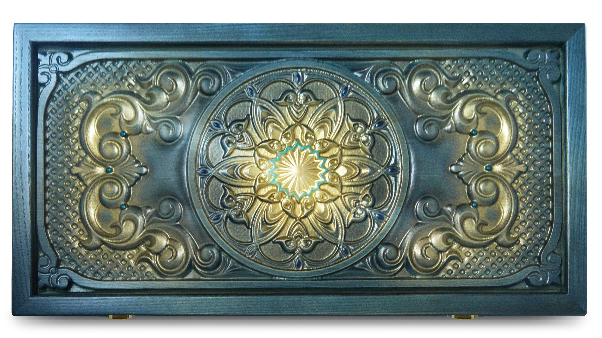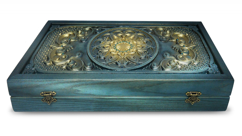 Нарды - шашки «Восток» относится к категории элитного товара и предназначена для настоящих ценителей не только игры, но иnbsp;nbsp;внешнего содержания. Модель изготовлена из массива ясеня,имеет отдельный ложемент для хранения фишек.. Резные элементы выполнены мастерами в ручную. Авторская выкраска отвечает восточным традициям: оттенки бирюзы в сочетании с позолотой.