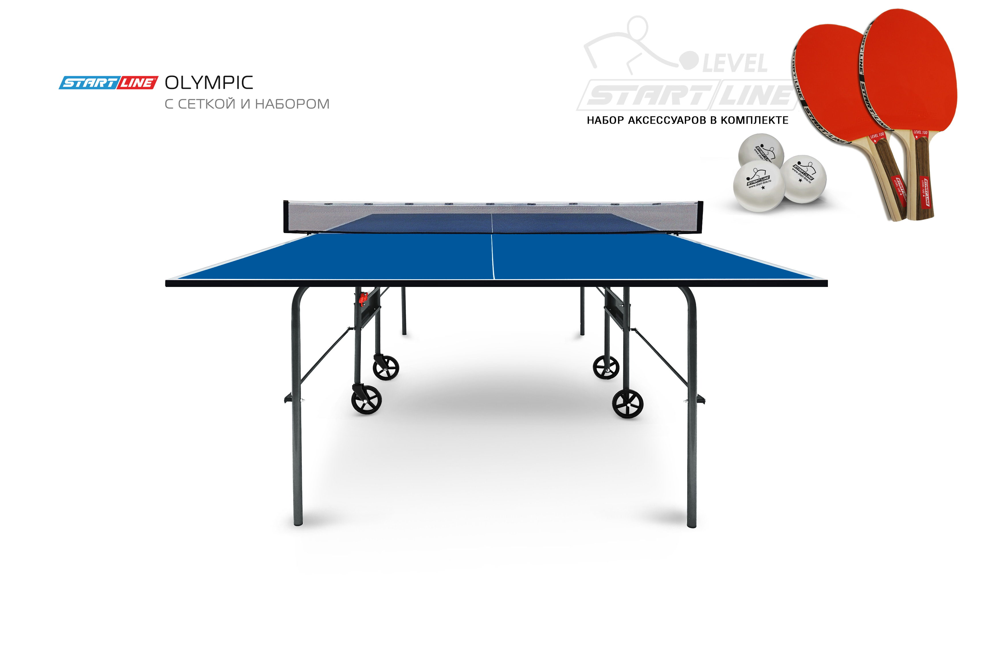 Теннисный стол Olympic - одна из самых популярных моделей ассортимента START LINE, которая относится к любительскому уровню теннисных столов для помещения. Столешница модели Olympic сделана из прочного материала ЛДСП толщиной 16 мм и покрыта меламином, что предотвращает появление трещин и сколов, обеспечивая равномерный отскок мяча. Кромка стола из пвх толщиной 0,45 мм защищает стол от повреждений. Теннисный стол Olympic имеет размеры 274 х 152,5 х 76 см в разложенном виде, что соответствует международному стандарту ITTF. Модель имеет простую и компактную систему складывания. Удобная система трансформации позволяет одному человеку легко сложить и разложить стол, делая его максимально компактным при хранении. Конструкцией предусмотрена возможность одиночной игры. Olympic оборудован встроенной сеткой, не требующей демонтажа при складывании. В комплекте со столом идет набор со всеми необходимыми для игры аксессуарами: 2 ракетки Level 100, 3 теннисных мяча Club Select. Стол очень маневренный за счет наличия двух поворотных транспортных и двух не поворотных колёс диаметром 125 мм. Транспортировочные колеса делают процесс установки и перемещения стола более простым, значительно экономя время и усилия при подготовке к игре. Теннисный стол Olympic прекрасно подходит для любительской игры в спортивном зале школы или домашних семейных турниров.