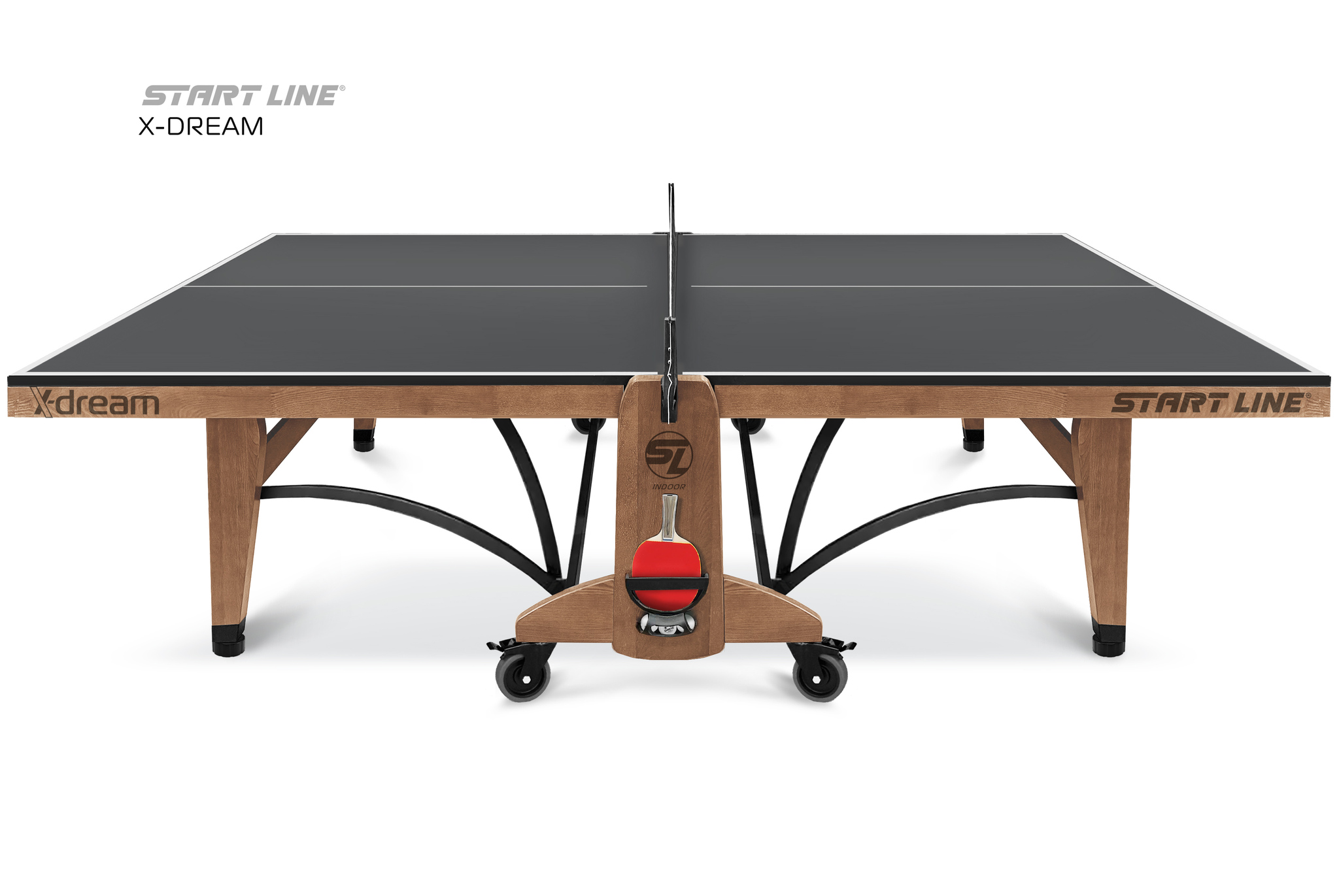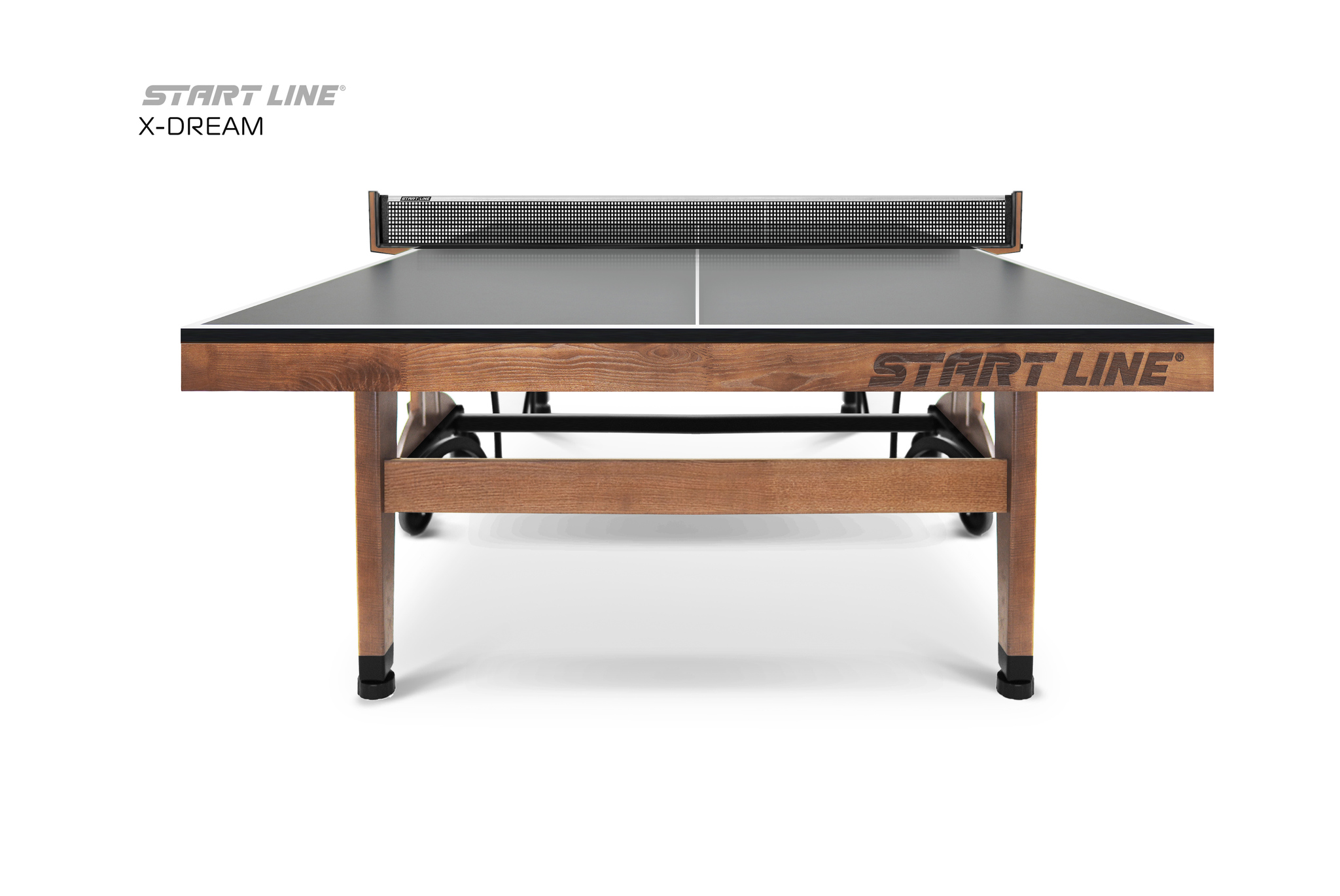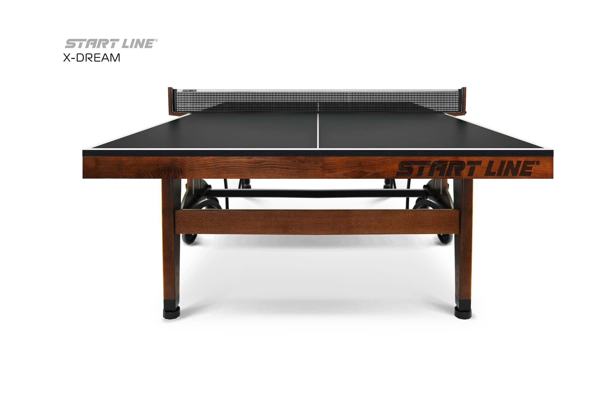 Теннисный стол X-DREAM от Start Line – воплощение элегантного дизайна, высоких игровых характеристик и инновационных технологий. Модель создана для требовательных игроков, ценящих стиль и надежность оборудования.nbsp;nbsp; Теннисный стол X-DREAM создан под брендом Start Line, который многие годы является символом качества и инноваций в мире оборудования для настольного тенниса.nbsp;nbsp;О принадлежности стола к имени ведущего российского производителя говорит не только первоклассное качество и высочайшие игровые характеристики стола, но и элегантный логотип, украсивший боковую поверхность основания и столешницы модели. Современный теннисный стол премиального уровня станет украшением любой игровой зоны. Модель X-DREAM с черной столешницей и основанием цвета темный ясень сочетает в себе стильный дизайн и функциональность. Столешница теннисного стола изготовлена из высокопрочного ЛДСП толщиной 22 мм, что обеспечивает идеальный отскок мяча и контроль над каждым ударом. Широкий деревянный кант 70 мм из ясеня повышает жесткость и надежность конструкции.nbsp;nbsp;Кромка из ПВХ 0,45 мм гарантируют высокую стабильность стола даже в условиях интенсивной эксплуатации. Отличительной особенностью модели является усиленная конструкция. Рама выполнена из комбинации высокопрочных древесины ясеня и стального профиля 50х25 мм с полимерным покрытием, что гарантирует высокую устойчивость и долговечность стола. Премиальная древесина ясеня в конструкции стола выполняет не только роль стабильного и долговечного материала, но и придает столу благородный внешний вид. Размер теннисного стола в рабочем состоянии: длина 274 см, ширина 152,5 см, высота 76 см, что соответствует стандарту ITTF. Совершенная система трансформации - уникальная разработка Start Line. Сложить и разложить модель без труда сможет один человек, а надежная фиксация положения гарантирует безопасность хранения и перемещения стола.nbsp;nbsp; Модель оборудована четырьмя регулируемыми опорами, которые позволяют выставить идеальный уровень игровой поверхности и обеспечивают стабильность положения стола. Четыре поворотных обрезиненных колеса диаметром 125 мм оснащены удобными стопорами, что позволит без труда переместить стол и зафиксировать его положение. Стол оснащен встроенной сеткой и двумя съемными держателями для хранения теннисных аксессуаров. Конструкция стола предусматривает одиночный режим игры, что делает его универсальным для различных сценариев тренировок. Теннисный стол X-DREAM – высокое качество и инновационный дизайн. Идеальный выбор для домашней игровой зоны, клуба или спортивного зала.nbsp;nbsp;Откройте премиальный уровень оборудования и наслаждайтесь каждым мгновением во время игры с X-DREAM!