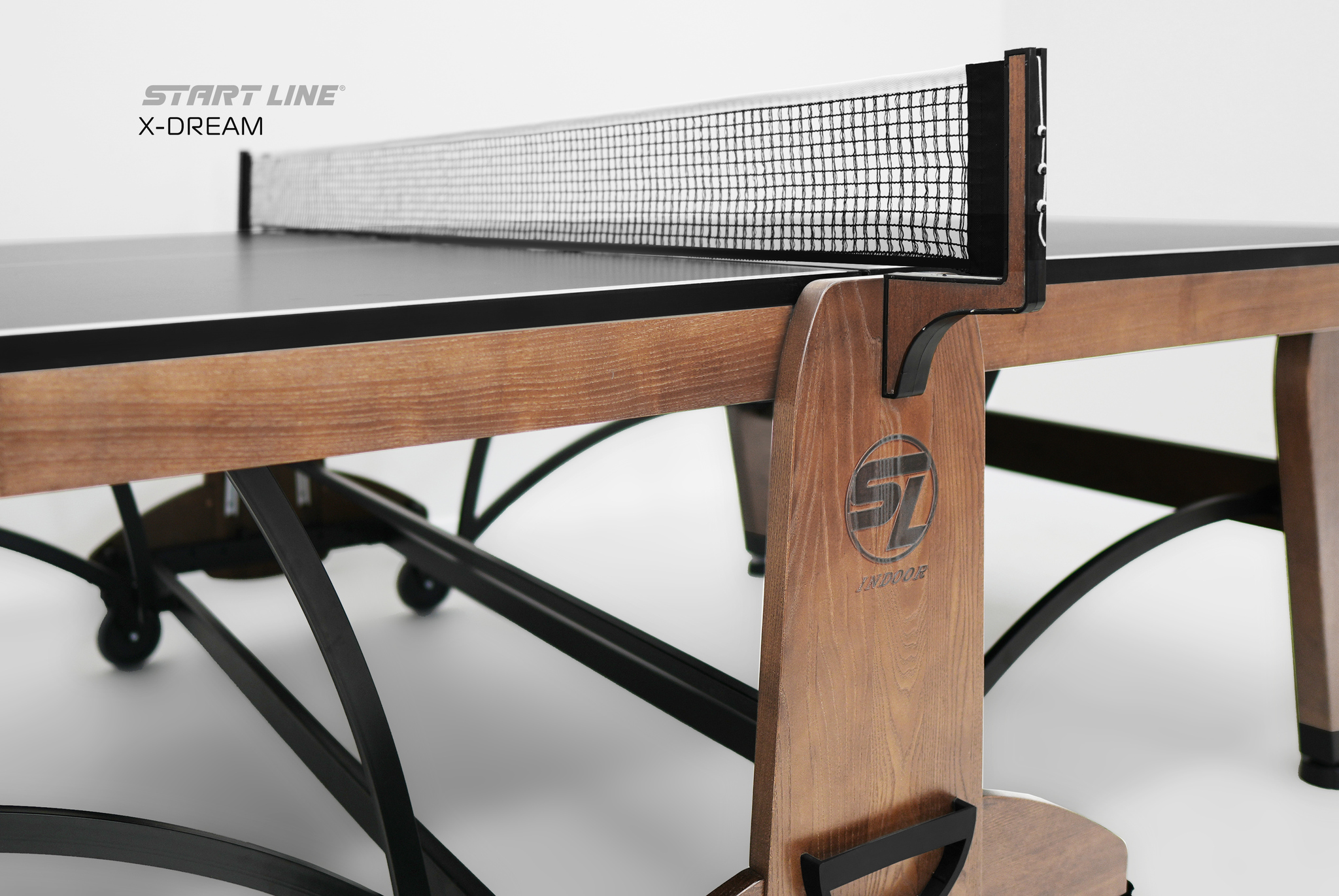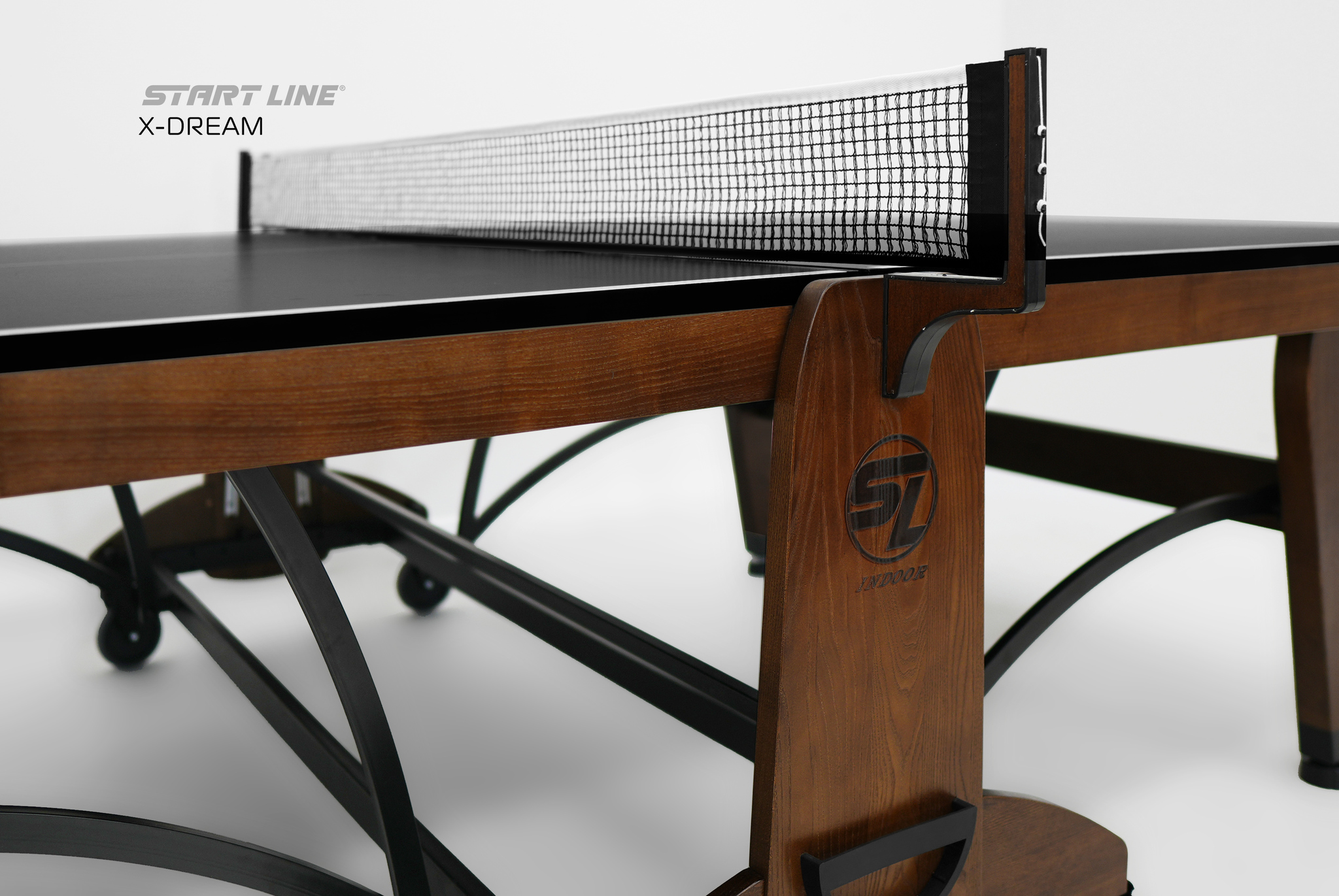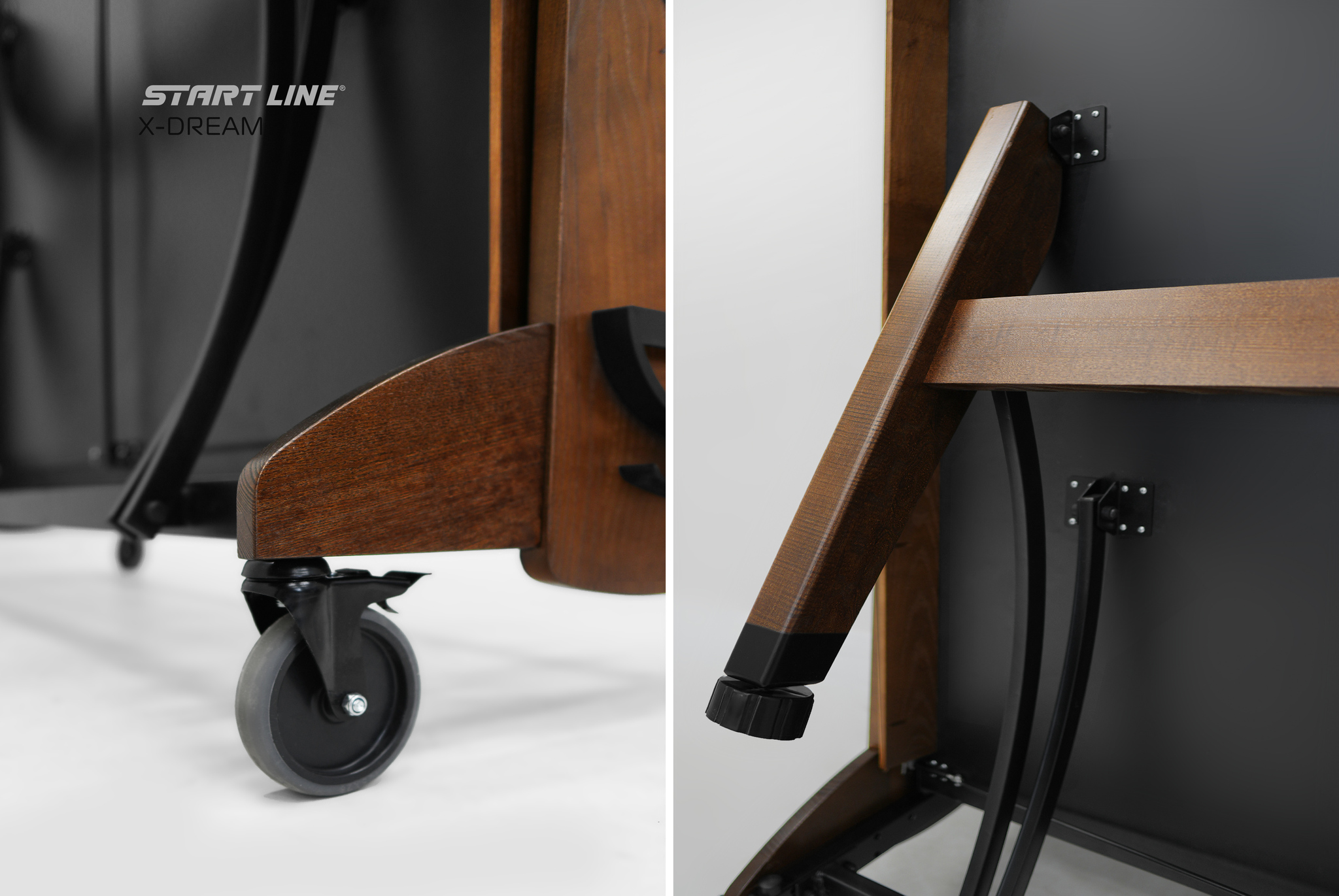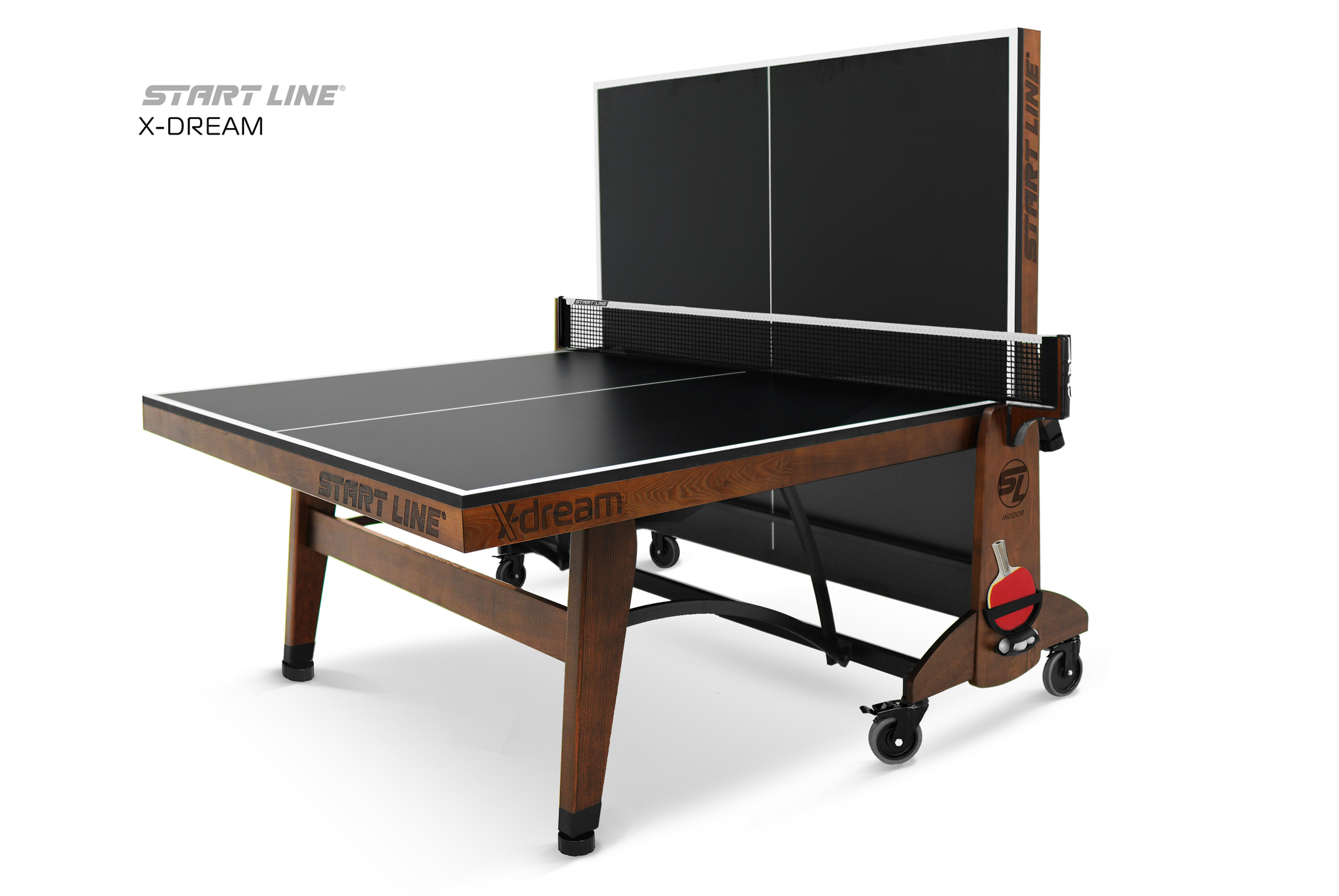 Теннисный стол X-DREAM от Start Line – воплощение элегантного дизайна, высоких игровых характеристик и инновационных технологий. Модель создана для требовательных игроков, ценящих стиль и надежность оборудования.nbsp;nbsp; Теннисный стол X-DREAM создан под брендом Start Line, который многие годы является символом качества и инноваций в мире оборудования для настольного тенниса.nbsp;nbsp;О принадлежности стола к имени ведущего российского производителя говорит не только первоклассное качество и высочайшие игровые характеристики стола, но и элегантный логотип, украсивший боковую поверхность основания и столешницы модели. Современный теннисный стол премиального уровня станет украшением любой игровой зоны. Модель X-DREAM с черной столешницей и основанием цвета темный ясень сочетает в себе стильный дизайн и функциональность. Столешница теннисного стола изготовлена из высокопрочного ЛДСП толщиной 22 мм, что обеспечивает идеальный отскок мяча и контроль над каждым ударом. Широкий деревянный кант 70 мм из ясеня повышает жесткость и надежность конструкции.nbsp;nbsp;Кромка из ПВХ 0,45 мм гарантируют высокую стабильность стола даже в условиях интенсивной эксплуатации. Отличительной особенностью модели является усиленная конструкция. Рама выполнена из комбинации высокопрочных древесины ясеня и стального профиля 50х25 мм с полимерным покрытием, что гарантирует высокую устойчивость и долговечность стола. Премиальная древесина ясеня в конструкции стола выполняет не только роль стабильного и долговечного материала, но и придает столу благородный внешний вид. Размер теннисного стола в рабочем состоянии: длина 274 см, ширина 152,5 см, высота 76 см, что соответствует стандарту ITTF. Совершенная система трансформации - уникальная разработка Start Line. Сложить и разложить модель без труда сможет один человек, а надежная фиксация положения гарантирует безопасность хранения и перемещения стола.nbsp;nbsp; Модель оборудована четырьмя регулируемыми опорами, которые позволяют выставить идеальный уровень игровой поверхности и обеспечивают стабильность положения стола. Четыре поворотных обрезиненных колеса диаметром 125 мм оснащены удобными стопорами, что позволит без труда переместить стол и зафиксировать его положение. Стол оснащен встроенной сеткой и двумя съемными держателями для хранения теннисных аксессуаров. Конструкция стола предусматривает одиночный режим игры, что делает его универсальным для различных сценариев тренировок. Теннисный стол X-DREAM – высокое качество и инновационный дизайн. Идеальный выбор для домашней игровой зоны, клуба или спортивного зала.nbsp;nbsp;Откройте премиальный уровень оборудования и наслаждайтесь каждым мгновением во время игры с X-DREAM!