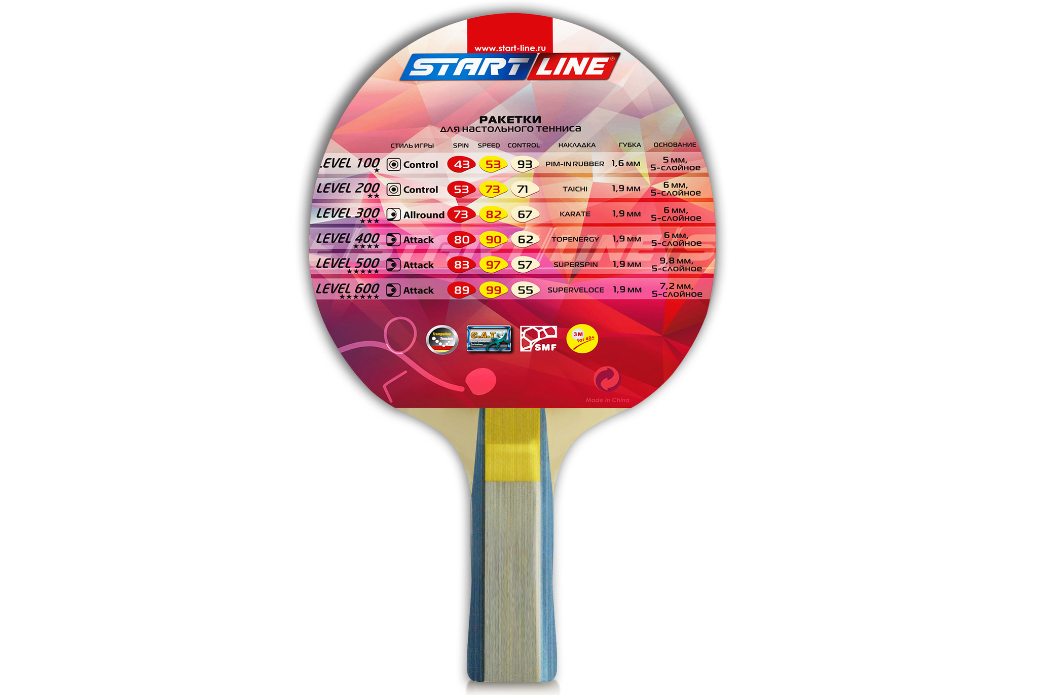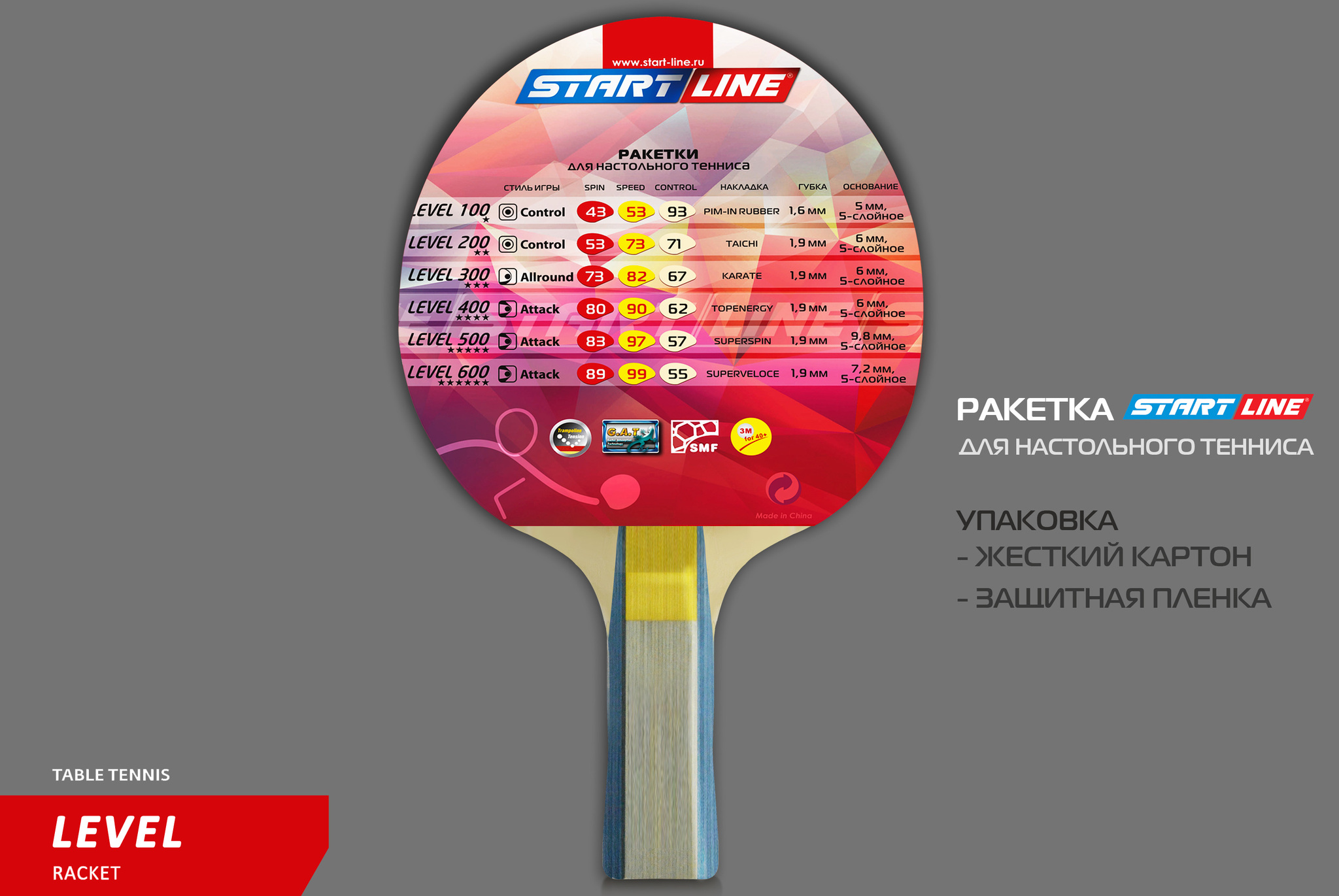 Ракетка для настольного тенниса Level 300 соответствует высокому современному стандарту качества, имеет обновленный дизайн, а также улучшенные технологические и игровые характеристики. В производстве ракеток Level 300 применены новейшие технологии: - Технология натяжения - Trampoline Tension Technology Уникальная технология, которая делает резину и губку с высоким натяжением. При игре резина хорошо поглощает атакующие удары мячей. Данный вид резины содержит натуральные органические вещества. - Технология поглощения - Gecko Adsorption Technology Эту технологию применяют при производстве резиновой поверхности ракетки. Так, на самой поверхности резины образуется множество выходных отверстие #40;как губка#41;, которые позволяют задержать мячи на резине. Благодаря этой технологии можно свободно контролировать мяч, его скорость и вращение. - Технология симметрии - Symmetrical Microcellular Foam Technology. Благодаряnbsp;nbsp;применению симметричного мелкопористого пенопласта, ракетка отличается эластичностью, легкостью и хорошим энергопоглощением.