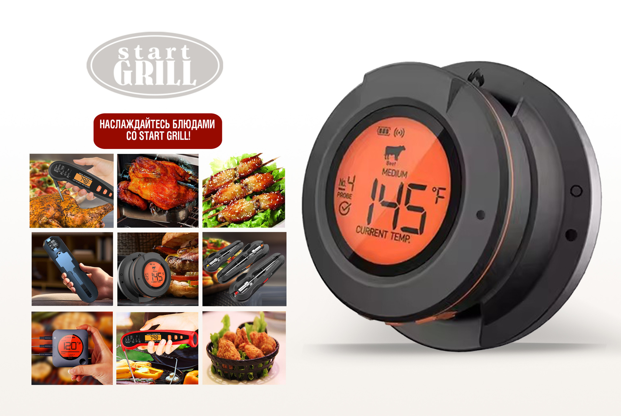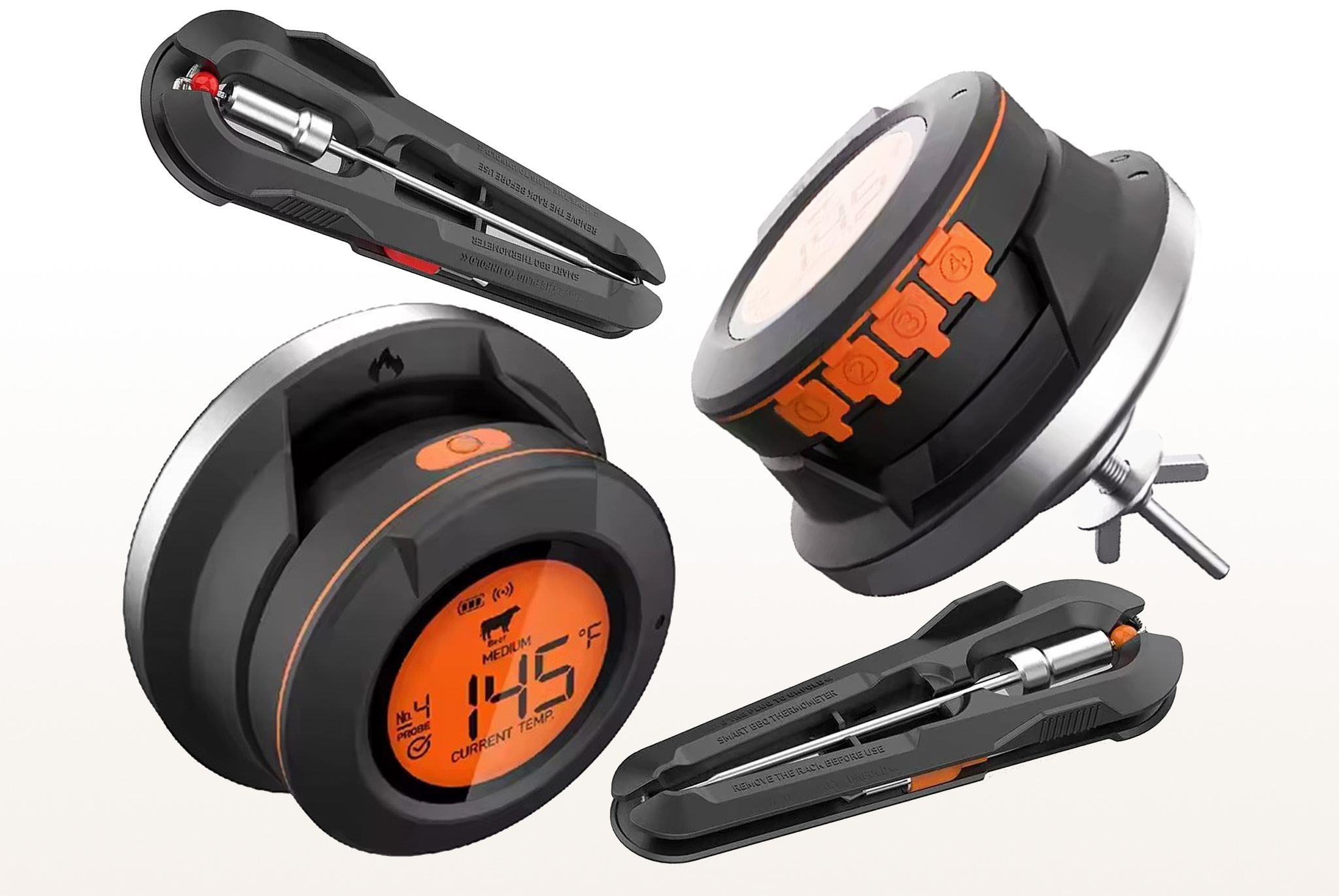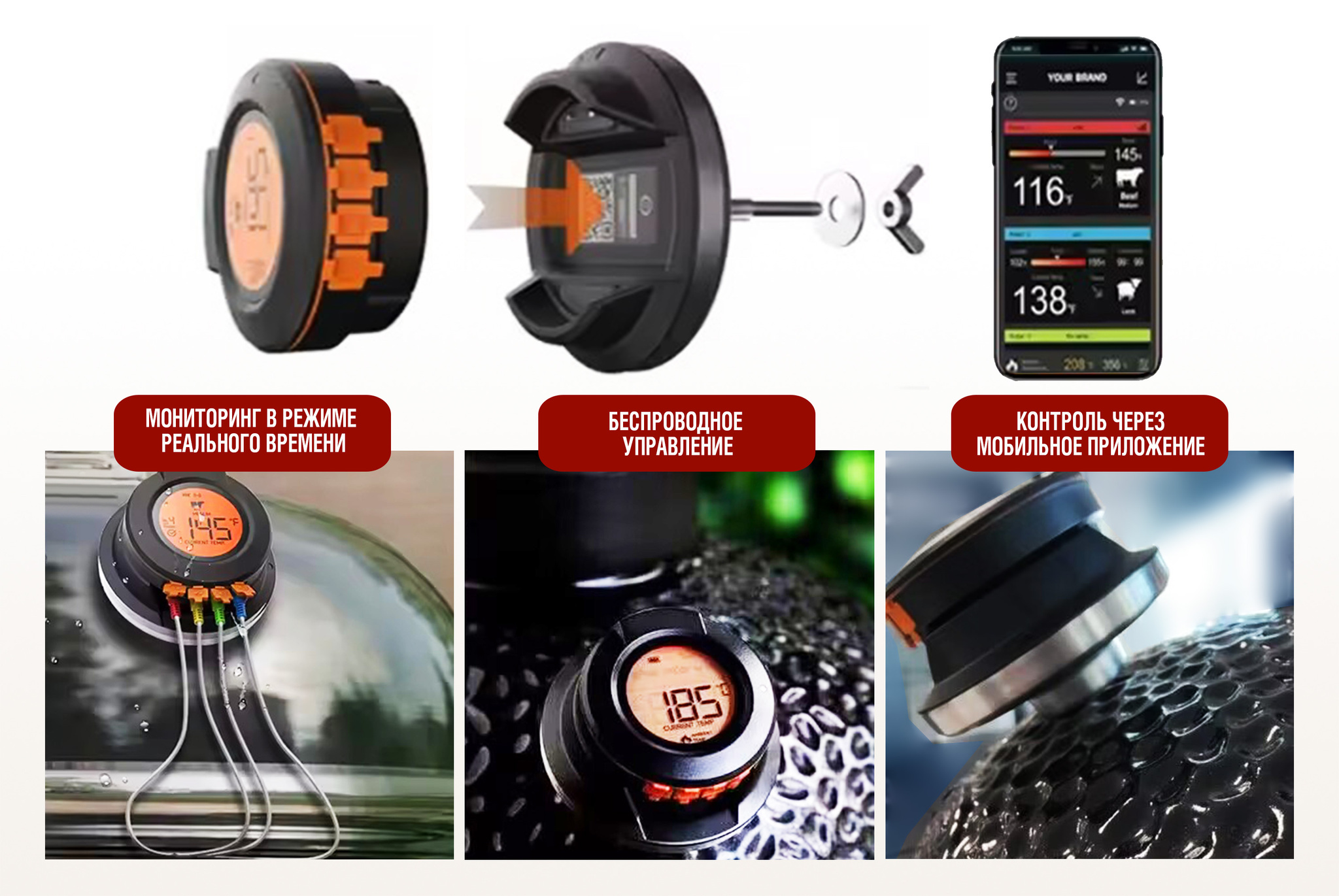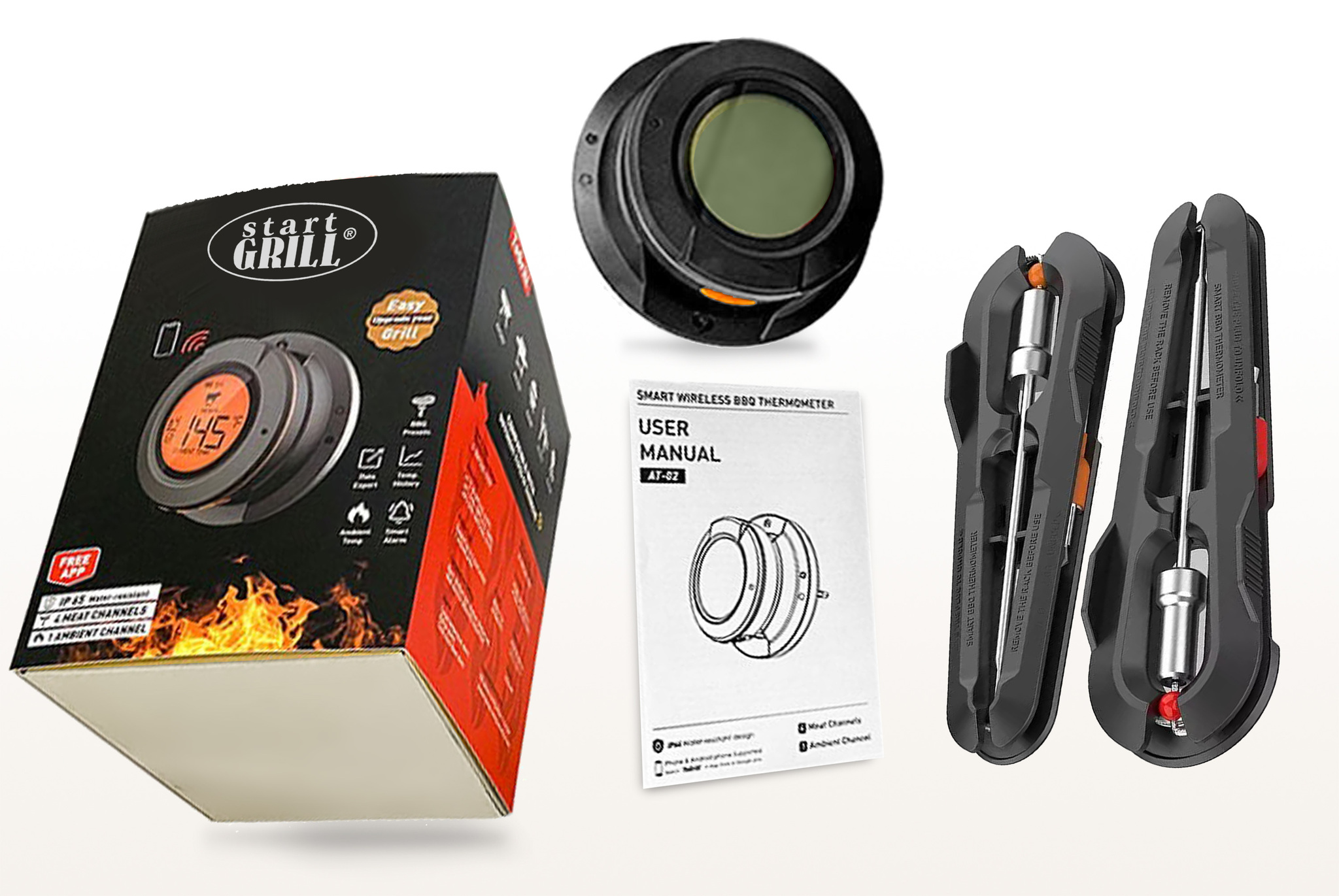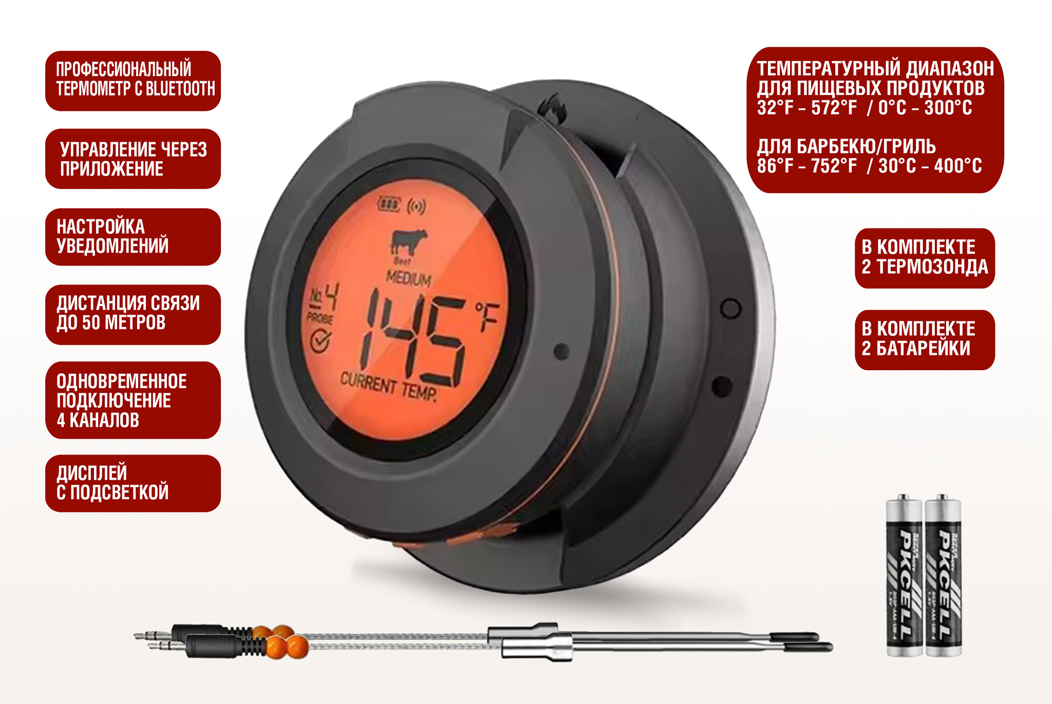 Интеллектуальный цифровой термометр Model 4 с Bluetooth/Wi-Fi сочетает удобство беспроводного контроля и профессиональную точность измерения. Model 4 поддерживает 4 канала подключения для одновременного мониторинга до 4 датчиков. В комплекте с термометром идет 2 тонких термозонда из нержавеющей стали для легкого погружения в мясо, рыбу, выпечку и другие продукты. Двойной температурный мониторинг в диапазоне измеренияnbsp;nbsp;для пищевых продуктов от 0 до 300°C #40;от 32 до 572°F#41; и окружающей среды #40;барбекю/гриль#41; от 30 до 400°C #40;от 86 до 752°F#41; делает его универсальным для контроля температуры приготовления различных блюд. Удобный для считывания дисплей покажет температуру с точностью до ±1°C #40;±1#37;#41; #40;в диапазоне 0~99°C#41;. Удаленный мониторинг через смартфон упрощает процесс, позволяя держать температуру приготовления под контролем на расстоянии до 50 м #40;165 футов#41; на открытом воздухе, 30 м #40;100 футов#41; в помещении. Управление через мобильное приложение по Bluetooth/Wi-Fi включает функциюnbsp;nbsp;настройки уведомлений о достижении заданной температуры, а также возможность подключения до 4 датчиков одновременно. Термометр работает от двух батареек AA,nbsp;nbsp;которые входит в комплект. Цифровой термометр Model 4 идеален для приготовления мяса, рыбы, овощей на гриле и барбекю, контроля температуры копчения и sous-vide, профессионального использования на кухне и открытом воздухе.