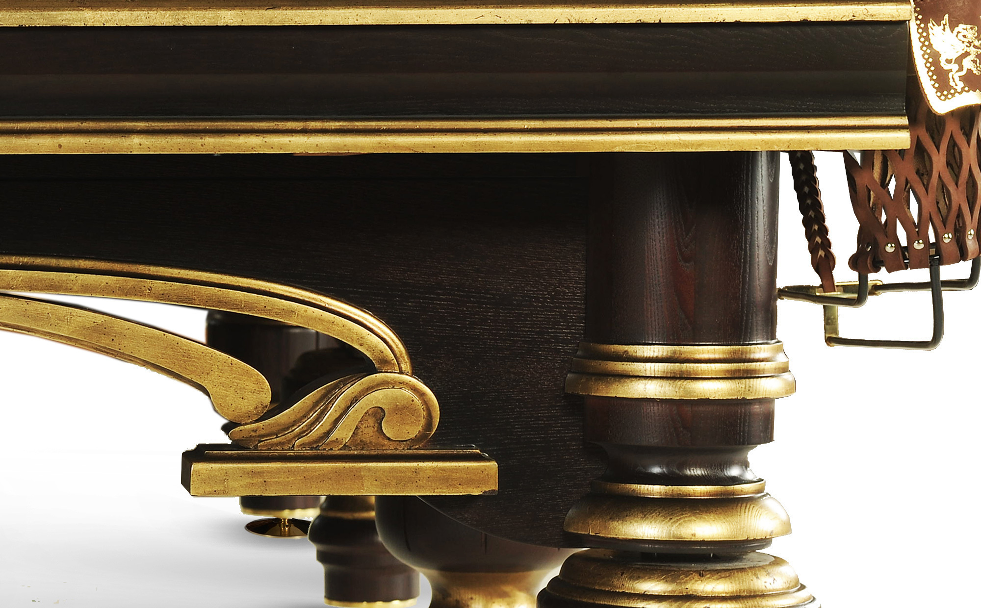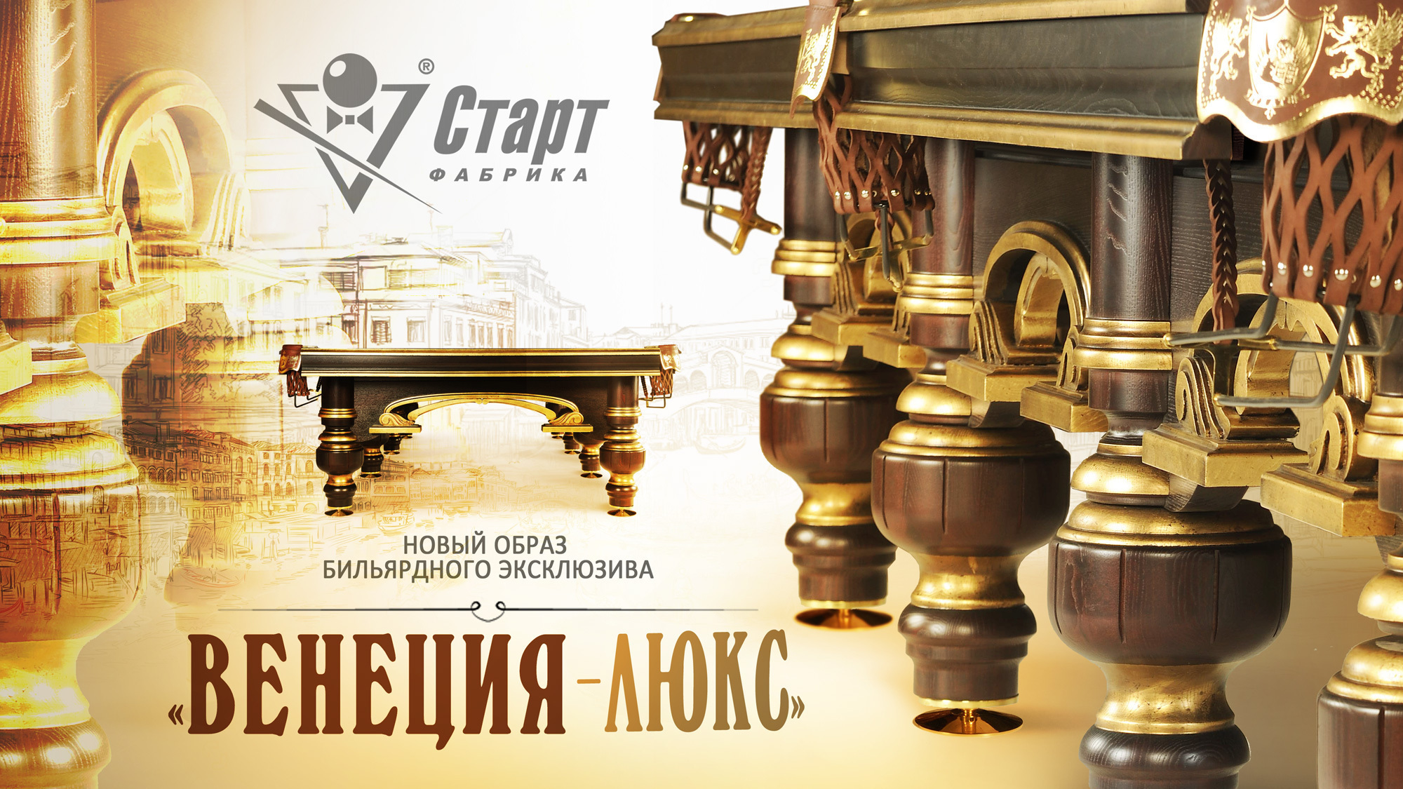 Представитель роскошной элегантности галереи эксклюзивных шедевров «Старт». Стилистика стола «Венеция-Люкс» отражает образ одноименного города, с его пышной архитектурой Эпохи Возрождения. Модель отличает особая роскошь отделки: золотая поталь украшает резной лафет ручной работы и элементы ног, тем самым делает силуэт бильярда выразительным и ярким.